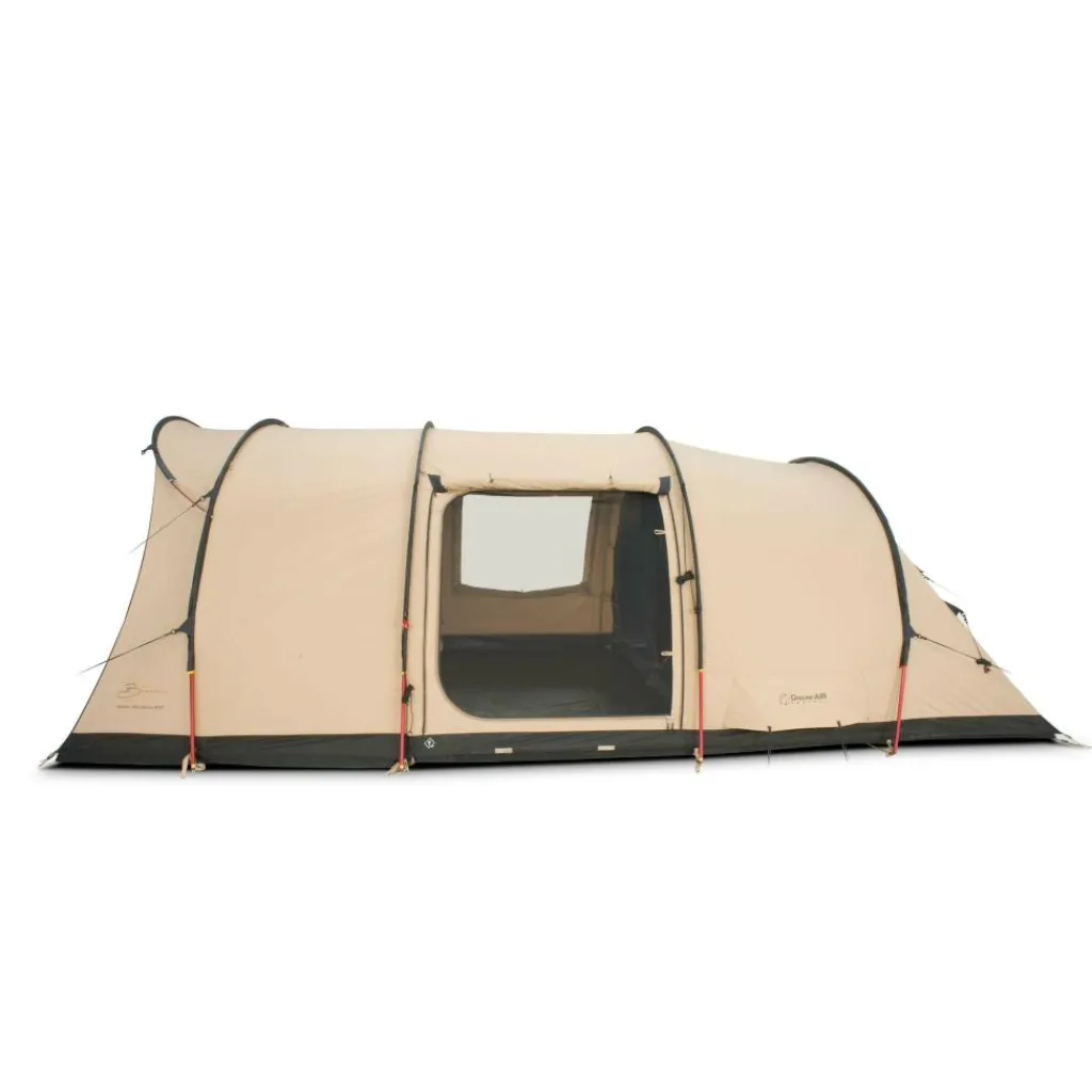De binnentent is van technisch katoen (katoen/polyester). Dat materiaal neemt vocht op en geeft het weer langzaam af, zodat u ’s nachts minder last heeft van klamme lucht. Onder uw voeten ligt een vast polyester grondzeil met een waterkolom van 5.000 mm, daarmee blijft de leefruimte ook bij langdurige regenval betrouwbaar droog. De aluminium boogstokken zorgen voor een stevige, toch relatief lichte constructie (totaal ca. 31 kg) en leveren extra stabiliteit bij wind.