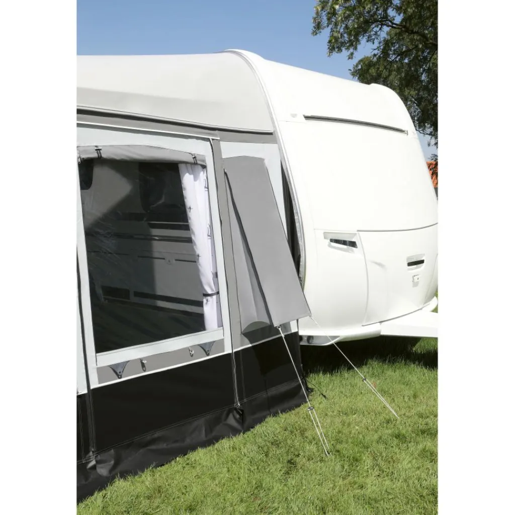 - De voortent wordt geleverd met een rechte tochtstrook, een wielflap en ladderspanners met kunststof haringen voor extra gebruiksgemak.