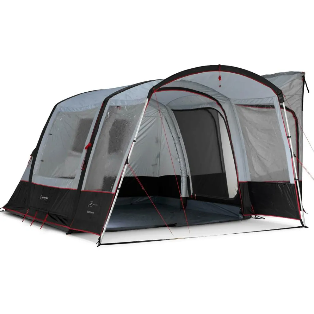 Het opzetten gaat vlot dankzij de opblaasbare luchtslangen. U hoeft geen losse stokken te schuiven, waardoor de tent snel en stabiel staat. De buitentent is uitgevoerd in 150D Honeycomb polyester met PU- en zilvercoating en heeft een waterkolom van 5.000 mm met getapete naden. Met deze combinatie blijft de leefruimte ook bij langdurige regen droog, terwijl de zilvercoating helpt om warmte binnen te beperken en extra privacy biedt. Het vast ingestikte PE grondzeil sluit de onderzijde netjes af tegen tocht, vuil en insecten. Extra zware deurritsen en zorgvuldig afgewerkte naden zorgen daarbij voor langdurige functionaliteit, ook bij intensief gebruik.