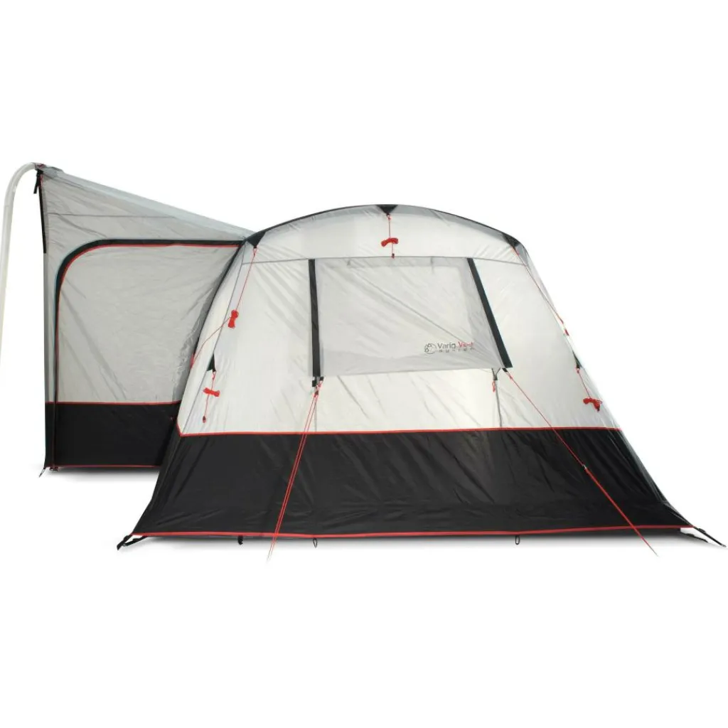 Voorin zorgt de geïntegreerde luifel voor een droge instap en extra schaduw. Dit is prettig bij wisselvallig weer of felle zon. De panoramaramen geven volop daglicht en het Vario-gordijnsysteem laat u per raam nauwkeurig bepalen hoeveel inkijk en licht u wenst. In de ruime leefruimte kunt u een donkere, los verkrijgbare slaapcabine plaatsen, handig wanneer u een extra slaapplek wilt creëren zonder aan woonruimte in te leveren. De zijaansluiting vormt de doorloop naar uw bus, zodat u beschut kunt in- en uitlopen. Dankzij de nette kabeldoorvoer en de goede ventilatiemogelijkheden blijft het geheel overzichtelijk en comfortabel tijdens uw verblijf.