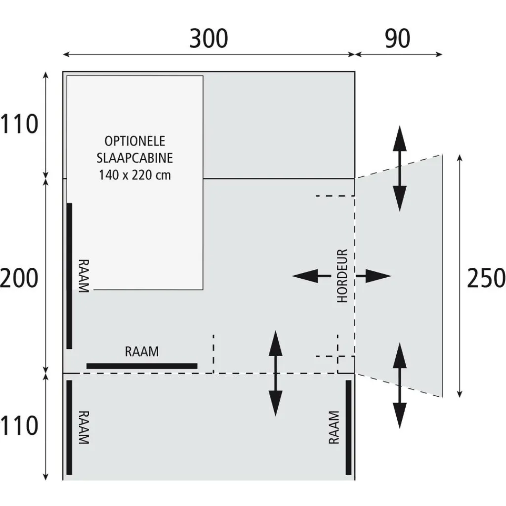 - Zijaansluiting met hoogtebereik 180 – 240 cm en een breedte van 250 cm: hierdoor sluit de tent op veel buscampers en bestelwagens aan.