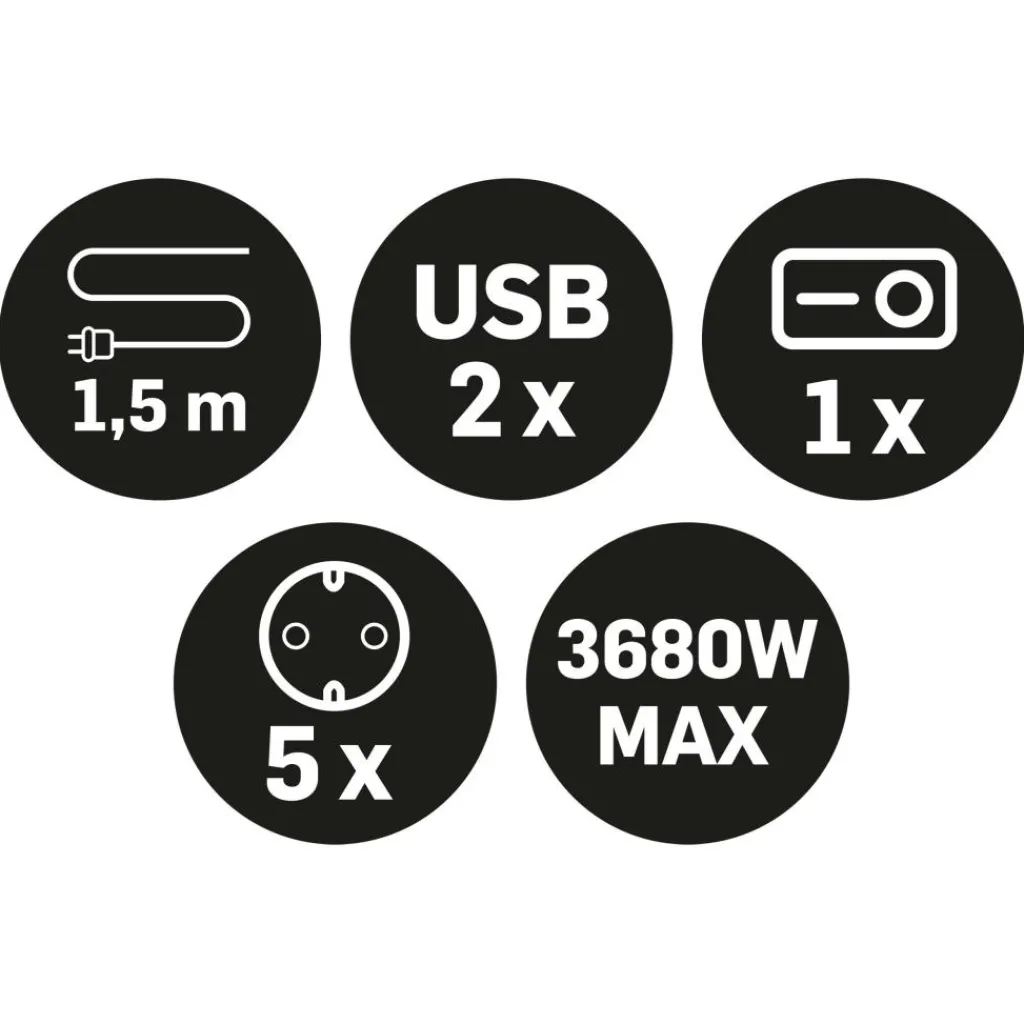 De Q-Link 5-voudige stekkerdoos met USB-A is een veelzijdige oplossing voor zowel het van stroom voorzien van elektronische apparaten als het opladen van USB A-apparaten. Dankzij de ingebouwde USB-poorten kunnen smartphones, tablets en andere gadgets eenvoudig worden opgeladen zonder dat extra adapters nodig zijn. Met de praktische schakelaar schakelt u alle aangesloten apparaten tegelijkertijd uit. De stekkerdoos wordt geleverd met een kabel van 1,5 meter lengte.