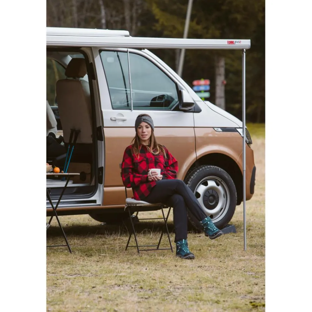 Het eenrichting oprolsysteem maakt het draaien van de luifel in de juiste richting eenvoudig. De dubbele schokdemping, met een schokdempende beugel met dubbele bout, beschermt zowel de luifel als het voertuig bij zware belasting. De verstevigde knikarmen met dubbele stalen kabels houden het doek strak, en de veiligheidsvergrendeling van de luifelpoten biedt flexibele bevestigingsmogelijkheden. Zo kunt u de hoogte van de voorbox eenvoudig afstellen. Deze cassetteluifel wordt geleverd inclusief standaard wandplaten voor montage tegen een vlakke wand.