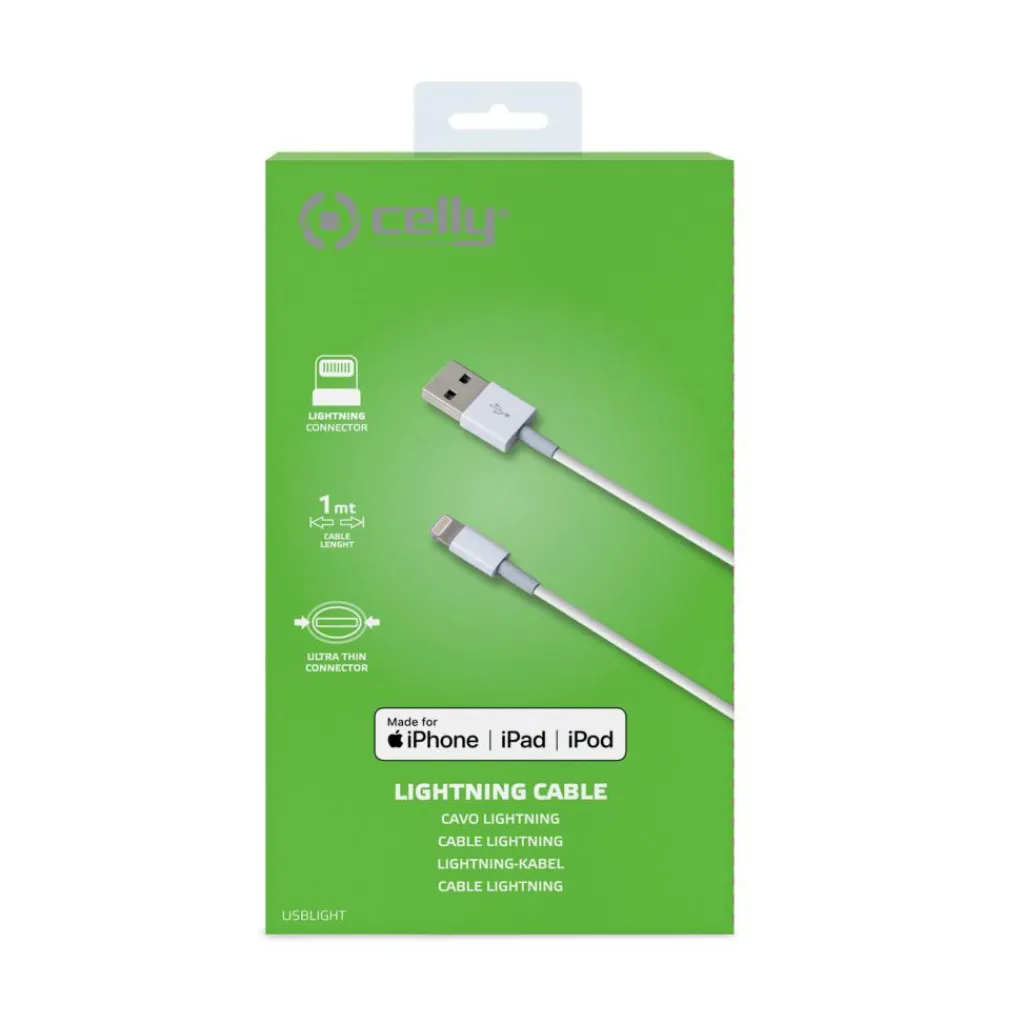 De Celly Lightning USB oplaadkabel heeft een ultradunne connector om op te laden en te synchroniseren via de USB poort van de computer of AC oplader. Deze kabel heeft een maximaal uitgangsvermogen van 2,4 ampère.