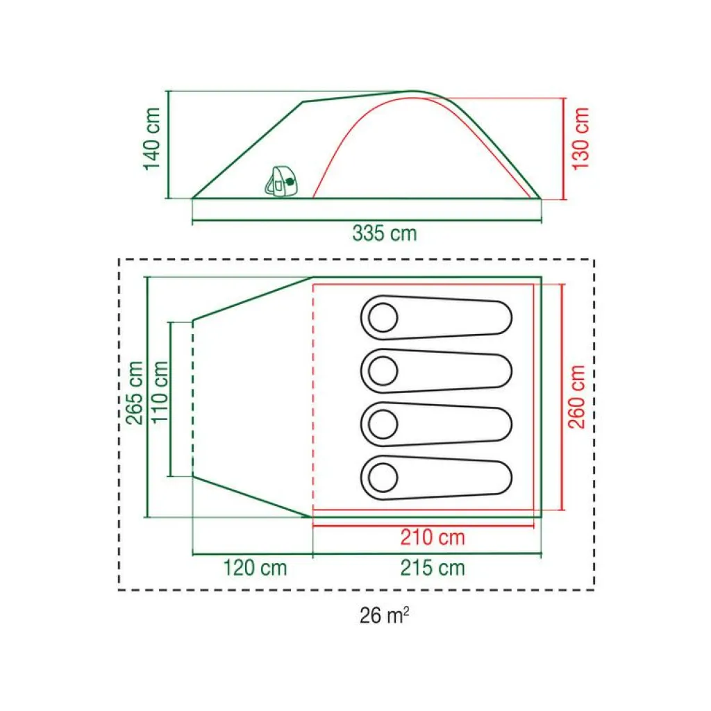 - Leefruimte: 120 x 265 cm met vast grondzeil, ideaal voor bagage, schoenen en koken bij de tent.