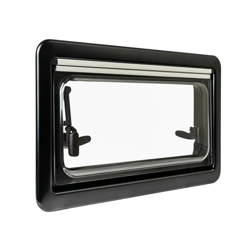 Het raam is geschikt om in te bouwen in campers en caravans met een wanddikte tussen 26 en 41 mm. Dit raam is snel en eenvoudig te monteren en gaat lang mee. Het binnen- en buitenframe zijn aan elkaar geschroefd waardoor deze aan de voertuigwand zijn geklemd. Hierdoor vormt het frame een langdurige en houdbare dichting. Het raam is grijs getint en gemaakt van acryl.
