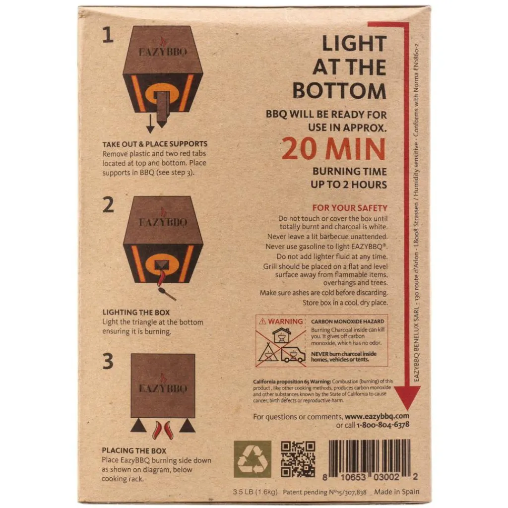 De EAZYBBQ Family houtskool is een pakket waarmee u alles-in-één heeft. Het pakket is eenvoudig aan te steken en binnen 10 tot 15 minuten is de barbecue gevuld met hoogwaardig houtskool. Deze box geeft tot 2 uur kooktijd en is geschikt voor 2 tot 8 personen. Alles is ecologisch geproduceerd, zo is het karton gerecycled en het houtskool voorzien van een FSC kwalificatie.
