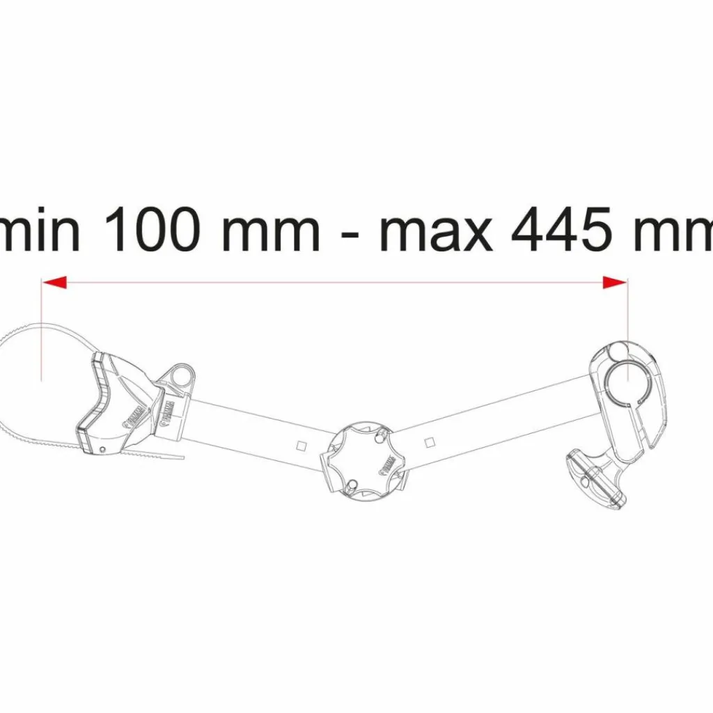 De Fiamma Bike-Block Pro S D1 fietsklem is verstelbaar en perfect te gebruiken in combinatie met de Fiamma Carry-Bike fietsendrager. Met de draaiknop kunt u deze Fiamma fietsklem vastzetten op de fietsendrager en het andere uiteinde past om een framebuis (met een diameter tussen de 25 en 100 mm) van uw fiets. Zowel de klem om uw fiets en de klem voor de fietsendrager kunnen 360 graden draaien en de fietsklem beschikt over een centraal gewricht, zodat u zelf de juiste stand van de fietsklem kunt bepalen. Daarnaast biedt deze klem een extra oog voor optionele fietsbeveiliging en een rubberen inzetstuk ter bescherming van de fiets.