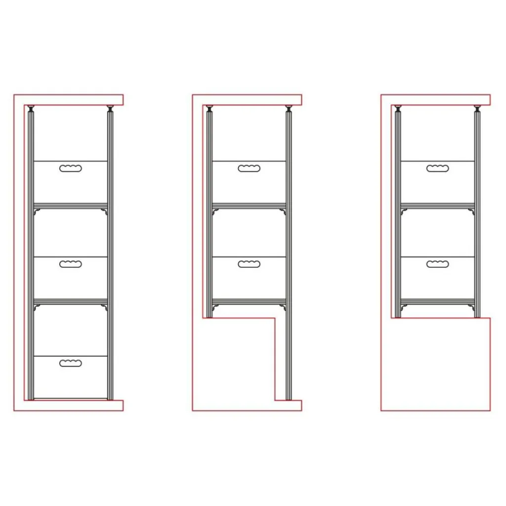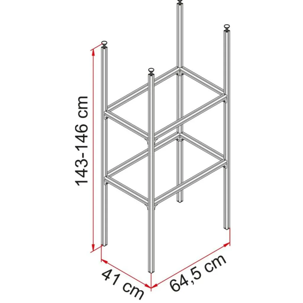 Het Fiamma Garage System, de standaard uitvoering bestaat uit een enkel vak met drie lagen waarin optionele opbergboxen kunnen worden geplaatst of eigengemaakte planken voor het creëren van extra ruimte. Het rek is in hoogte verstelbaar en de staanders kunnen worden ingekort indien nodig.
