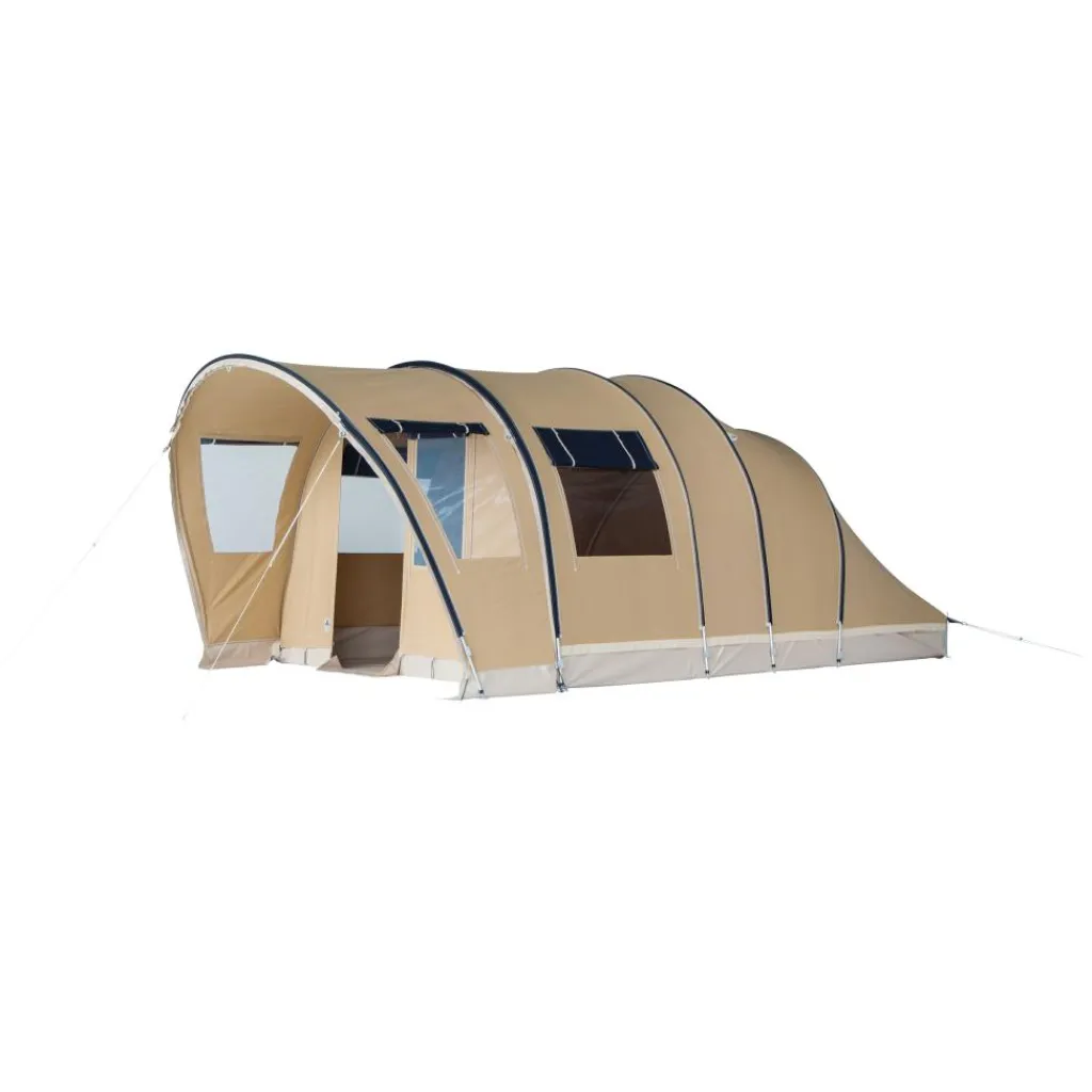 Het buitendoek is van 100% Ten Cate katoen met een doekdikte van 310 g/m². Dat katoen ademt, waardoor condens vermindert en de temperatuur in de tent aangenamer blijft, ook bij zomerse dagen en koelere nachten. Het leefgedeelte is uitgevoerd met een vast bisonyl grondzeil met een 25 cm hoge opstaande rand. Met dit grondzeil houdt u wind, opspattend water en ongedierte buiten, terwijl de rand bij de entree neerklapbaar is zodat u drempelloos in- en uitloopt.