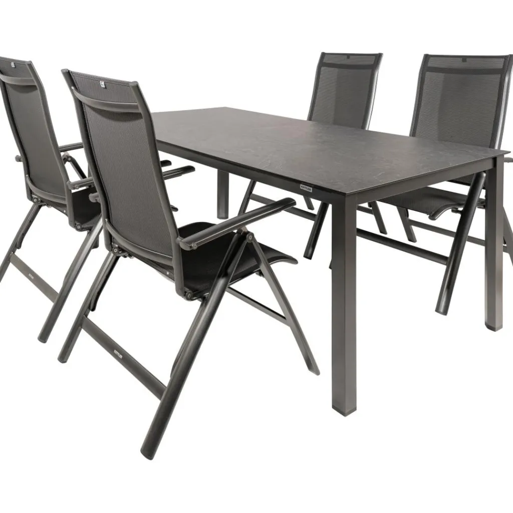 De Kettler HPL 180 Legato 4 verstelbaar tuinset jura antraciet omvat een tuintafel en vier Legato Curve verstelbare tuinstoelen. De HPL tuintafel is vervaardigd van High Pressure Laminate met een aluminium onderstel, wat duurzaamheid en eenvoudig onderhoud biedt. Het moderne design met lichte constructie is bestand tegen diverse weersomstandigheden en UV-straling, wat zorgt voor langdurige kwaliteit. De Legato Curve tuinstoelen zijn comfortabel en weerbestendig, met vier verstelbare posities. Ze hebben een aluminium frame en een zitting en rugleuning van textileen, waardoor ze zeer onderhoudsvriendelijk zijn.