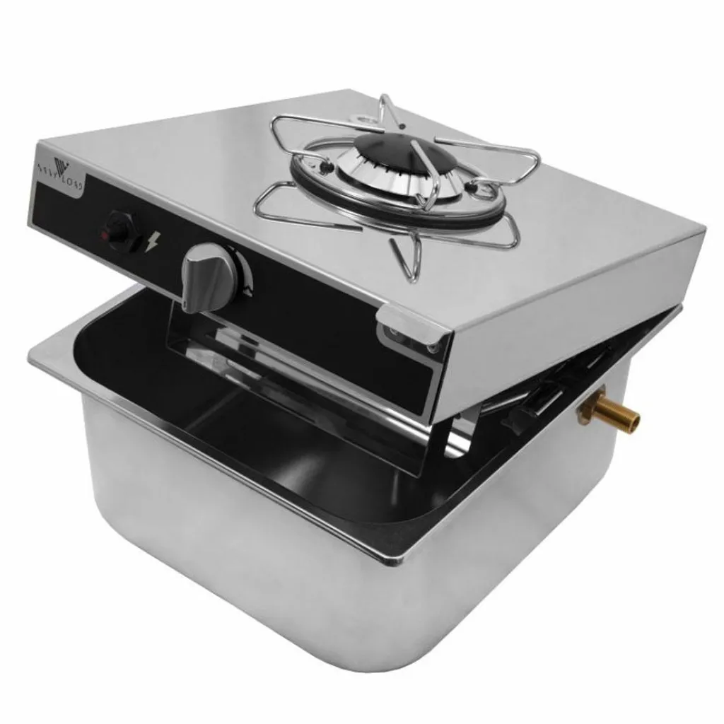 Deze Navy Load NL.23000 kook-spoelcombinatie heeft een kookplaat als deksel op de spoelbak. De kookplaat is voorzien van 1 brander met een piëzo-ontsteking. Deze combinatie wordt geleverd met een waterkraan en zonder een afvoer.
