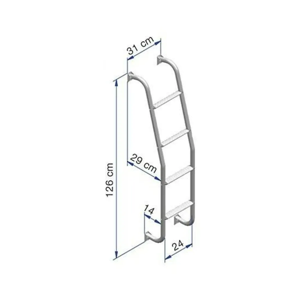 Geanodiseerd aluminium ladder met 4 treden voor gebruik achterop bijvoorbeeld een bestelbus. De ladder heeft een licht gebogen ontwerp.