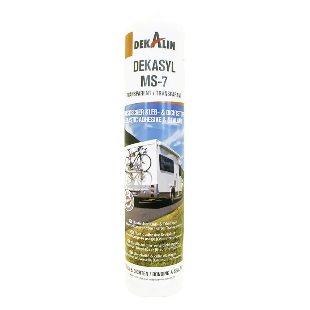Dekasyl MS-7 van Dekalin is een elastische lijm en afdichtingkit in één met MS-polymeer als basisbestanddeel. De buigzame kit is universeel toepasbaar en dus geschikt voor transparante verbindingen en afdichtingen tussen nagenoeg alle materialen. Onmisbaar voor onderhoud en reparatie aan bijvoorbeeld bus, caravan, auto en camper.
