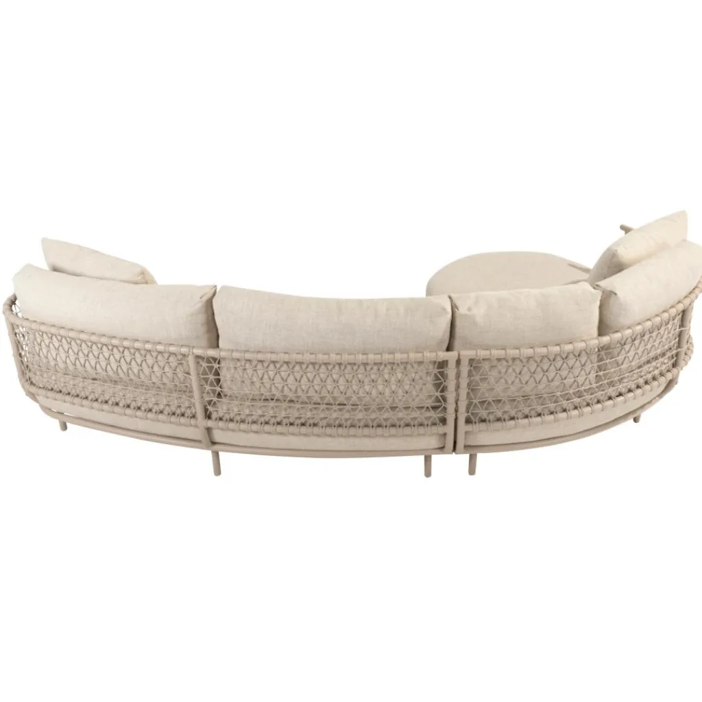 De 4 Seasons Outdoor Sardinia Chaise LoungesetLatte combineert stijl en comfort in een duurzaam ontwerp. Deze set bestaat uit een 2-zitsbank met linker armleuning en een Chaise lounge met rechter armleuning. Het stevige aluminium frame, afgewerkt met een latte-kleurige poedercoating, biedt uitstekende stabiliteit. De zandkleurige kussens, bekleed met weerbestendige Volga-materiaal, zijn extra gevuld voor optimaal zitcomfort. Dankzij de kleurvaste en waterafstotende eigenschappen is deze loungebank perfect geschikt voor langdurig buitengebruik.