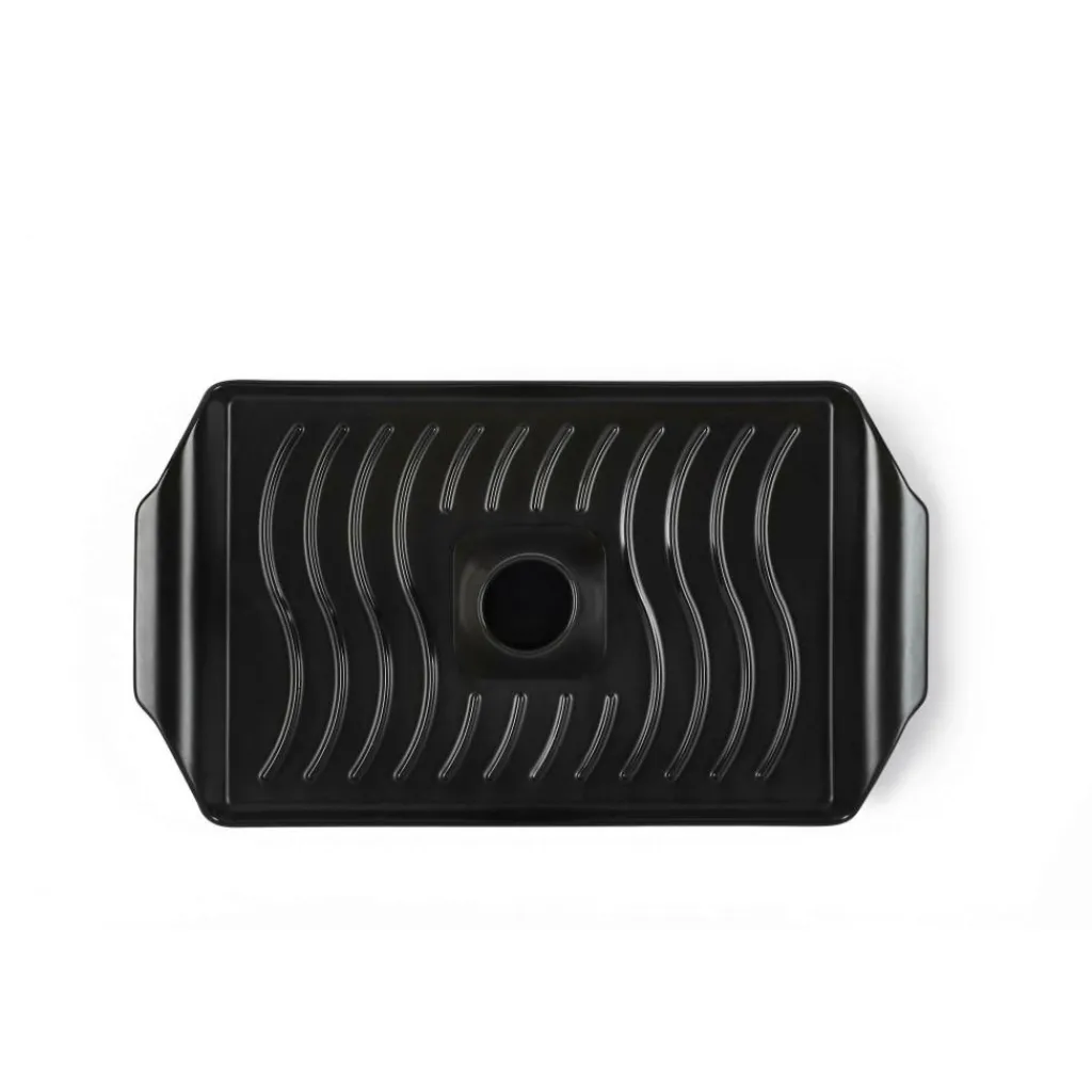 De Napoleon Keramische grillplaat met kiphouder bestaat uit een braadpan met grillpatroon en een verwijderbare kiphouder voor het maken van kip op bierblik. Deze grillplaat is voorzien van een antiaanbaklaag en kan na gebruik in de vaatwasser. De braadcilinder wordt op de pan bevestigd om de kip te roosteren en op smaak te brengen met bier, sap of marinade. De pan is 48 x 25 centimeter en geschikt voor een kip van 1,3 tot 2,7 kilogram.