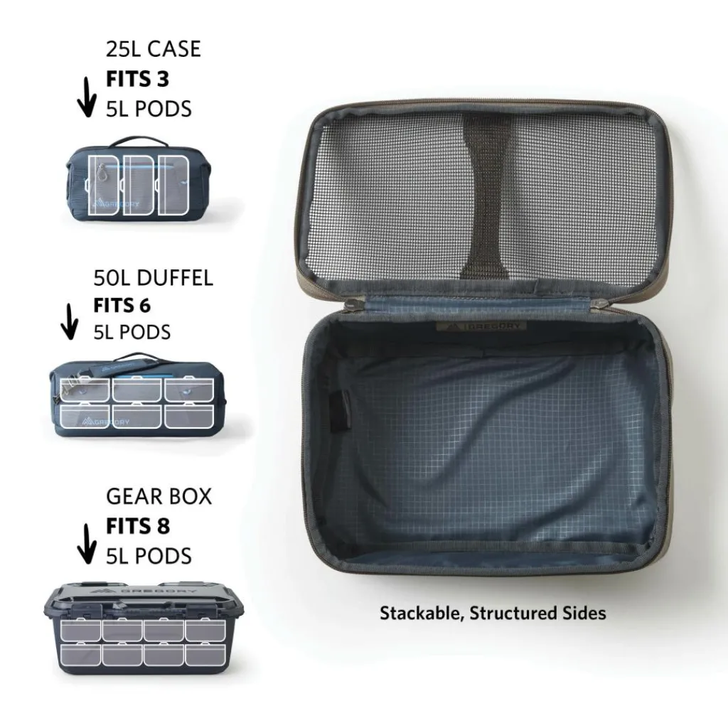 De Gregory Alpaca Gear Pod opbergbox heeft een deksel van mesh met ritssluiting en gewatteerde wanden en bodem. Hierdoor is deze opbergbox van Gregory overzichtelijk in te delen en stapelbaar. De box is gemaakt van stevig ripstop polyester en heeft een hengsel aan de bovenkant.