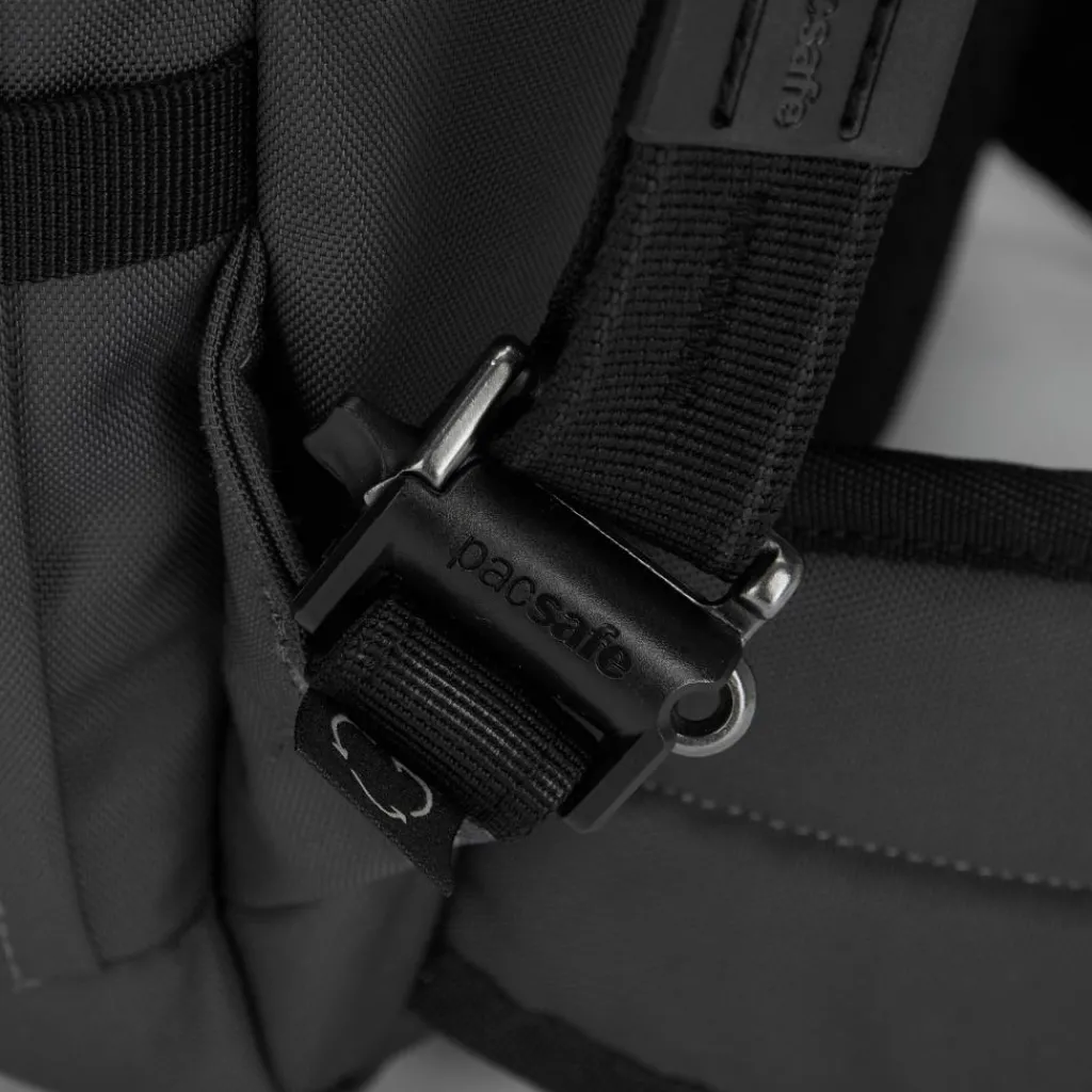 Deze EXP45 rugzak van Pacsafe heeft een bevestigingspunt, waarmee u hem veilig vast kunt maken aan een object om diefstal tegen te gaan. Aan de binnenkant zitten vakken met RFID-beschermend materiaal, zodat uw belangrijke pasjes en persoonlijke gegevens niet uitgelezen kunnen worden. Daarnaast kunt u hiermee uw eigendommen netjes opbergen. Rondom de rugzak en in de schouderbanden is staaldraad verwerkt, zodat dieven uw tas niet open kunnen snijden. Ook de rits is bestendig tegen het doorprikken met een scherp voorwerp. De rugzak kan gedragen worden met de schouderbanden, maar deze kunnen ook worden opgeborgen wanneer u er voor kiest om de tas met de hand te dragen aan een van de diverse handvaten.