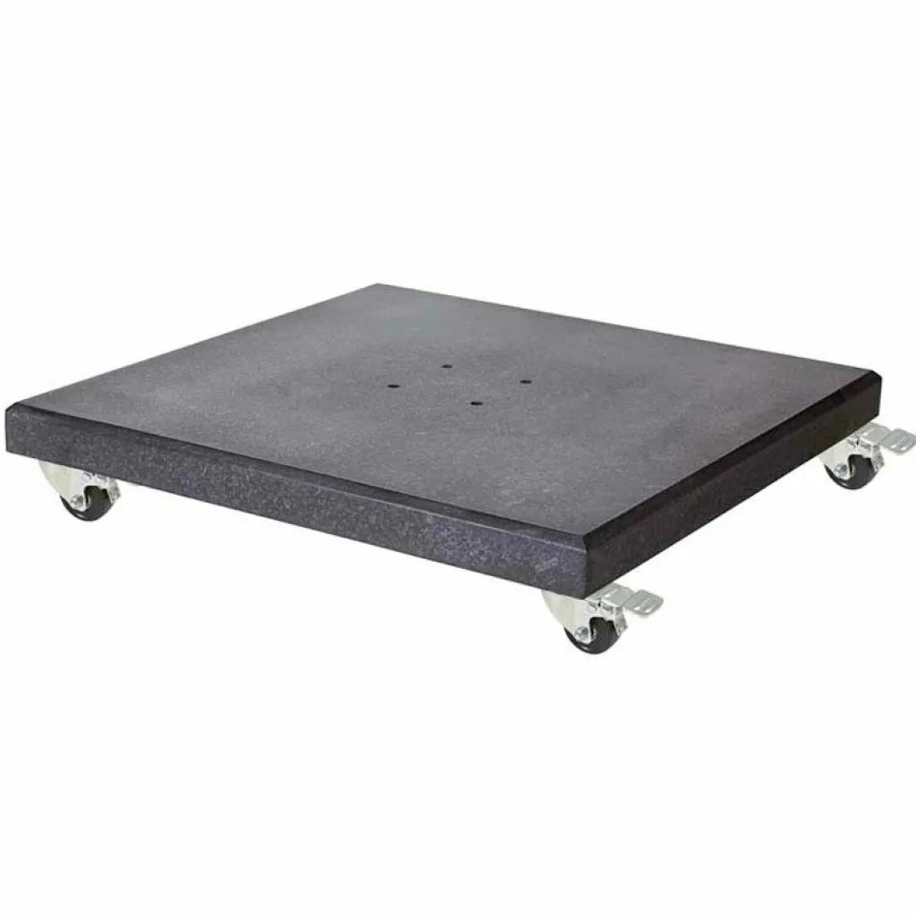 De Platinum Modena parasolvoet op wielen is een luxe gepolijste voet gemaakt van graniet. Met een gewicht van ongeveer 90 kg is deze voet geschikt voor de Platinum Solarflex, Deltawing, Challenger en Voyager parasols. Ook kan de parasolvoet gebruikt worden voor Falcon parasols en de Bardani Daytona. Dankzij de vier zwenkwielen kunt u de parasol eenvoudig verplaatsen, de rem zorgt ervoor dat de parasol op zijn plek blijft staan. De parasol wordt op vier plaatsen vastgeschroefd aan de granieten parasolvoet. De hartafstand op de voet is 113 mm, als uw parasol een andere afmeting heeft dan is deze voet niet geschikt. De voet is geschikt voor parasols tot 3 x 3 meter vierkant en 3,5 meter rond.