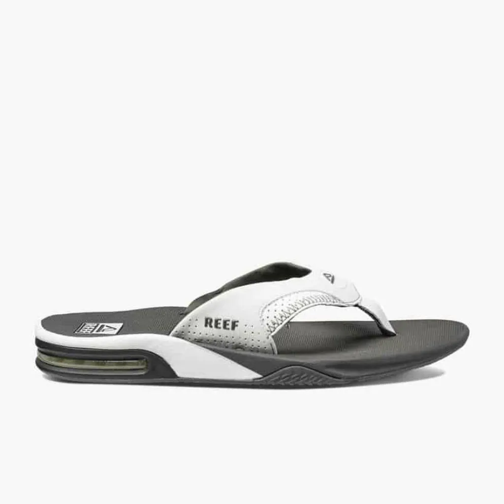 Deze Reef Fanning slippers voor heren komen in de kleuren grey en white. De inspiratiebron van deze slippers is gebaseerd op de surf topsporter Mick Fanning. De synthetisch gevoerde band met nubuck upper zorgt ervoor dat uw voeten op een comfortabele manier in de slippers zitten. Verder geeft het zachte voetbed van de slippers u het gevoel dat u op wolken loopt. Aan de onderzijde van de slipper zit een verborgen flesopener voor als u zin heeft een verkoelend drankje.