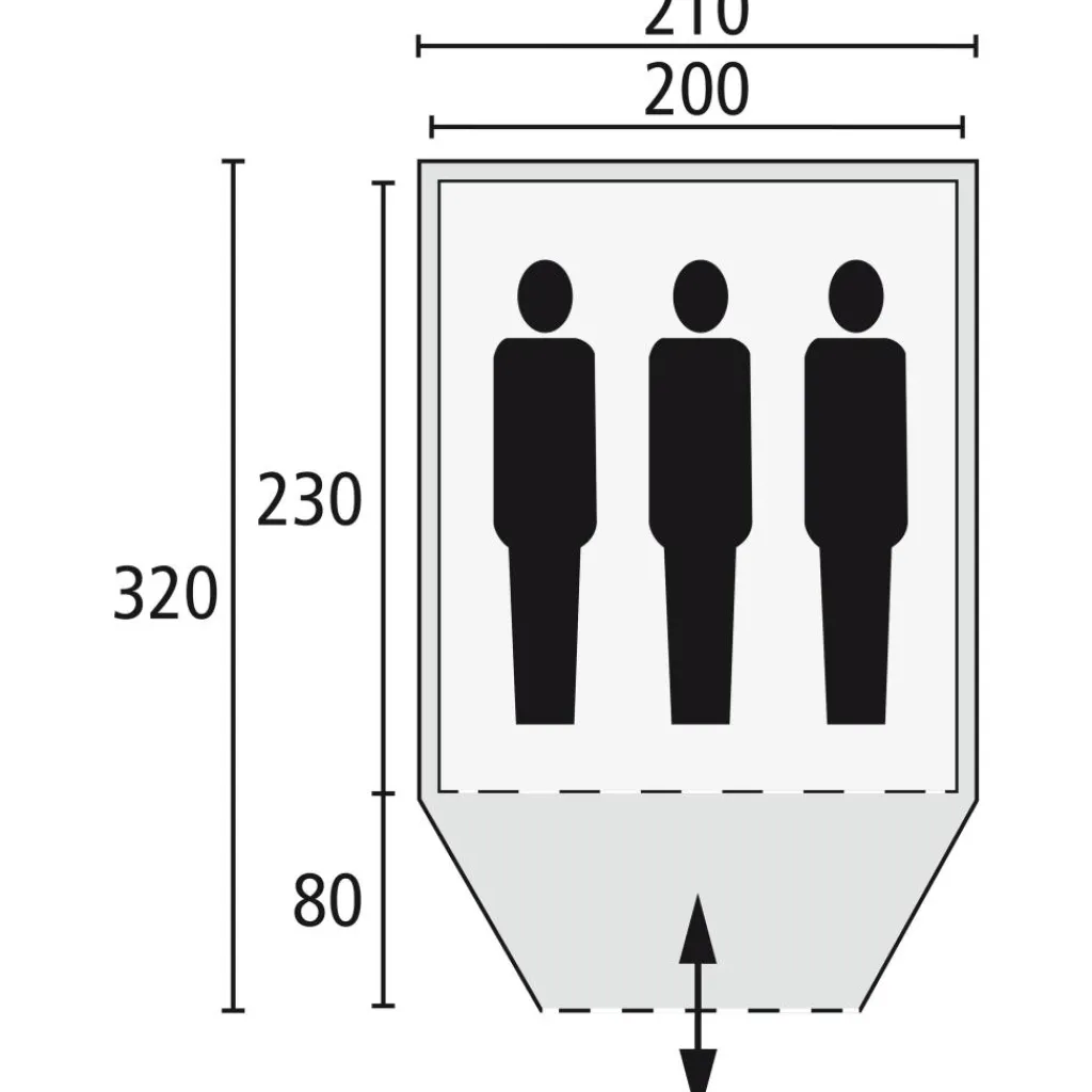 De Speed 210 Plus heeft één royale slaapcabine van 230 x 200 cm. Dat biedt plaats aan drie reguliere slaapmatten en nog wat ruimte aan het voeteneinde voor kleine spullen. De maximale hoogte van 125 cm geeft voldoende zitruimte om u om te kleden of tassen te ordenen. Voor de cabine ligt de voorruimte van 80 x 210 cm, ideaal als droge ruimte bij regen en als extra bergruimte. De totale maat van 320 x 210 cm blijft handzaam op de kampeerplaats, terwijl u binnen verrassend veel kwijt kunt. Zo krijgt u een praktische, snelle en comfortabele oplossing als bijzettent of korte‑vakantietent, zonder gedoe met losse boogstokken.