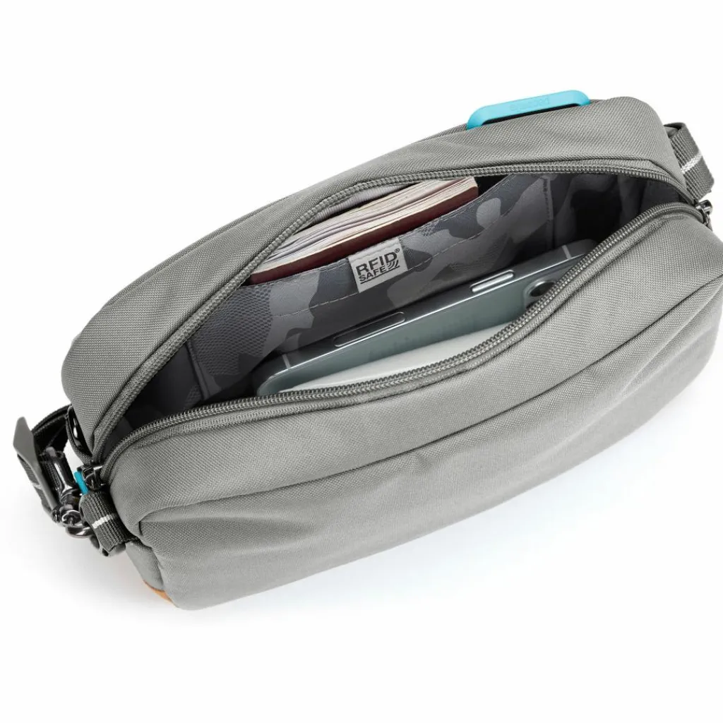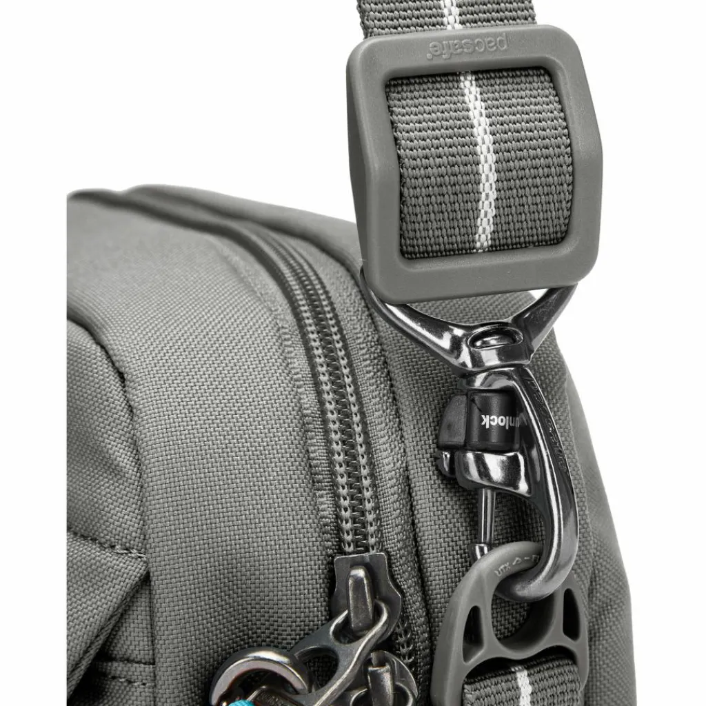 De ritsen van deze GO schoudertas van Pacsafe zijn afsluitbaar of zijn moeilijker open te ritsen, zodat dieven niets uit uw tas kunnen pakken. Belangrijke documenten en pasjes kunt u beschermen tegen het uitlezen ervan, door ze in het RFID-blokkerende vak te doen. Uw portemonnee en sleutels kunt u in de tas vastmaken, zodat ze er niet uit kunnen vallen wanneer u iets uit uw tas pakt. Aan de draagriem zit een beveiligde haak, die u kunt gebruiken om de tas te bevestigen aan een vast object voor nog meer veiligheid.