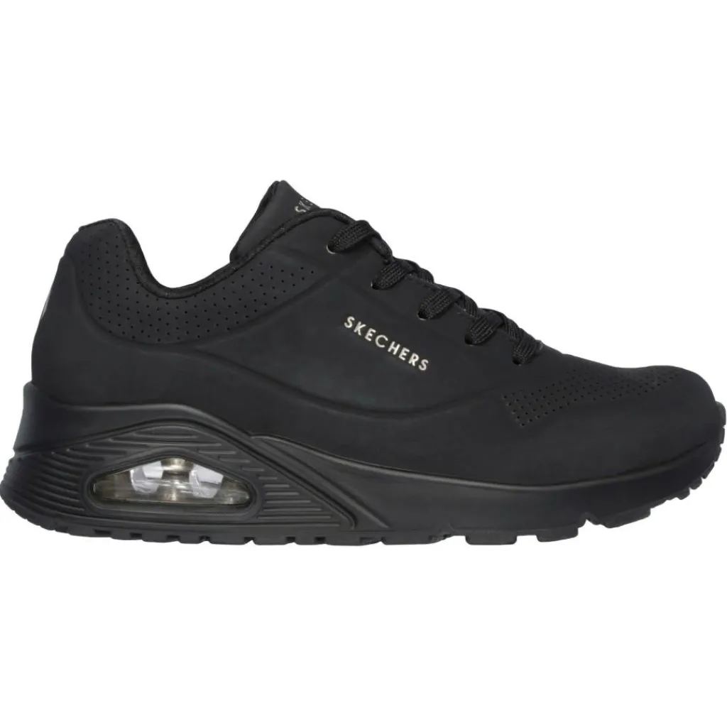 De Skechers Uno – Stand on Air schoenen voor dames hebben een retro uiterlijk en zijn helemaal zwart. De Air Cushioned tussenzool geeft samen met de Air Cooled Memory Foam binnenzool veel comfort.
