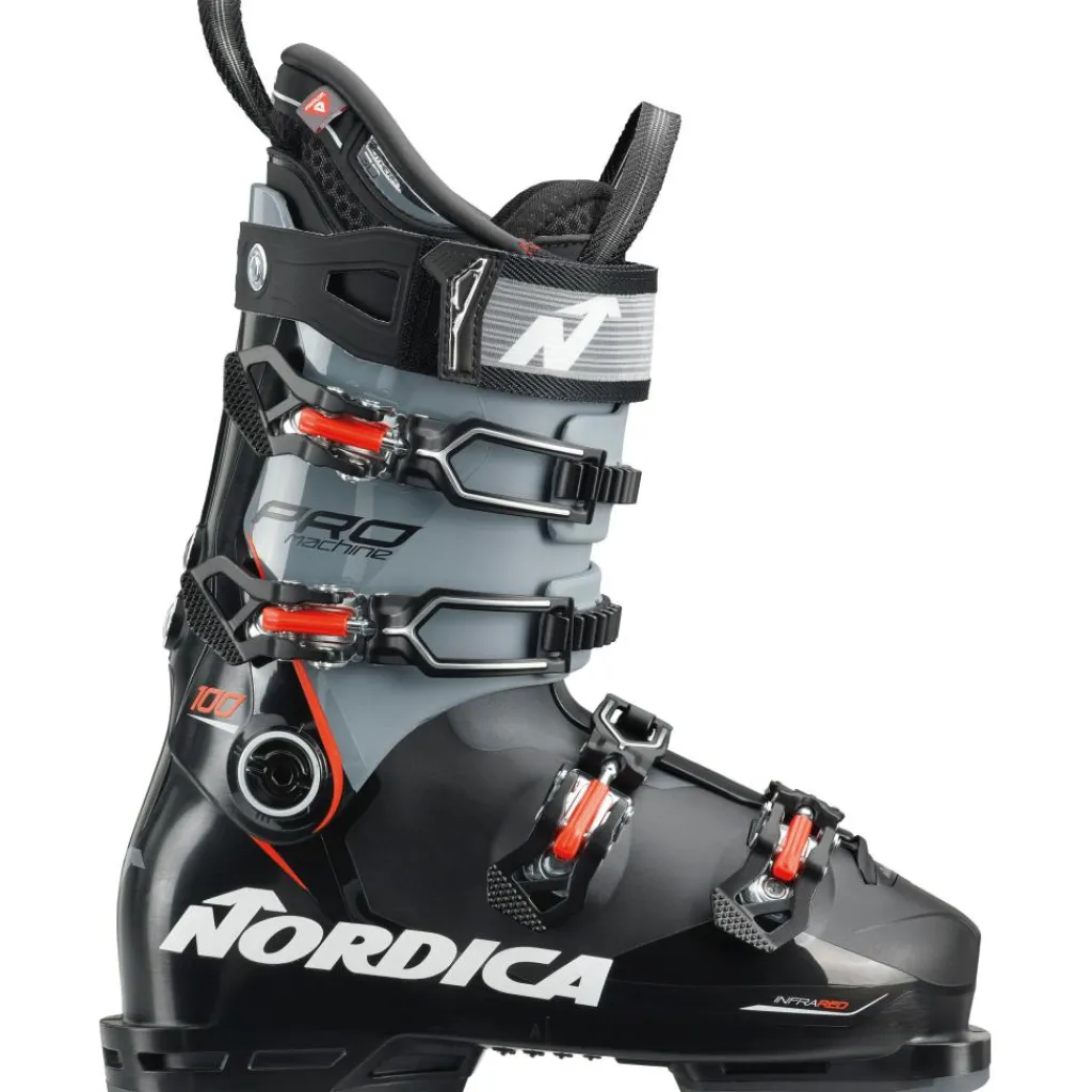 De Nordica Pro Machine 100 skischoenen voor heren zijn ontworpen als een vergevingsgezinde, maar toch uiterst reactieve skischoenen. Dankzij het gebruik van stijver plastic langs de ruggengraat van de schaal, biedt de Promachine 100 stabiliteit en snelle energieoverdracht. Met een laag volume, lichtgewicht ontwerp en Primaloft voering voor extra warmte en zachtheid, leveren deze schoenen optimale energie en responsiviteit. De anatomische schaal met een leest van 98 millimeter en 3D-voering, aanpasbaar via infraroodverwarming, biedt nauwkeurige bochten en voldoende rebound.