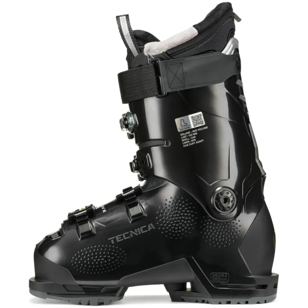 De Tecnica Mach Sport MV 95 X W GW skischoenen voor dames komen in een exclusieve uitvoering. Deze skischoenen van Tecnica hebben een hoogwaardige voering van N.F.S. Celliant materiaal, dat door middel van hitte aangepast kan worden naar de vorm van uw voeten. Met de vier buckles kunt u de skischoenen naar wens aan laten sluiten en daarnaast hebben deze schoenen ook een klittenbandsluiting. U stapt vanwege de Double Quick Instep eenvoudig in de schoenen en lopen over straat is dankzij Gripwalk ook geen probleem.