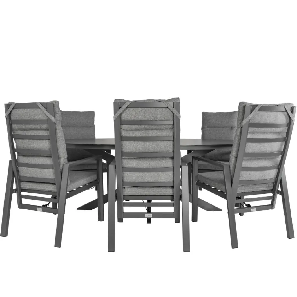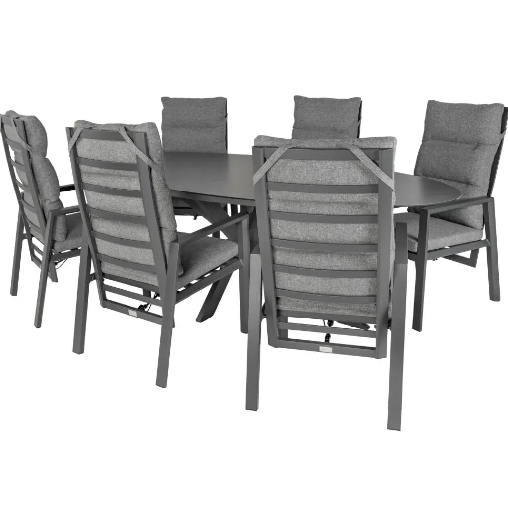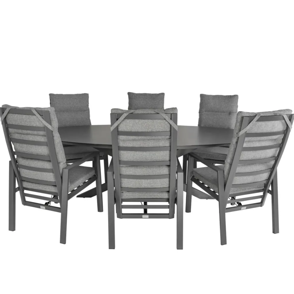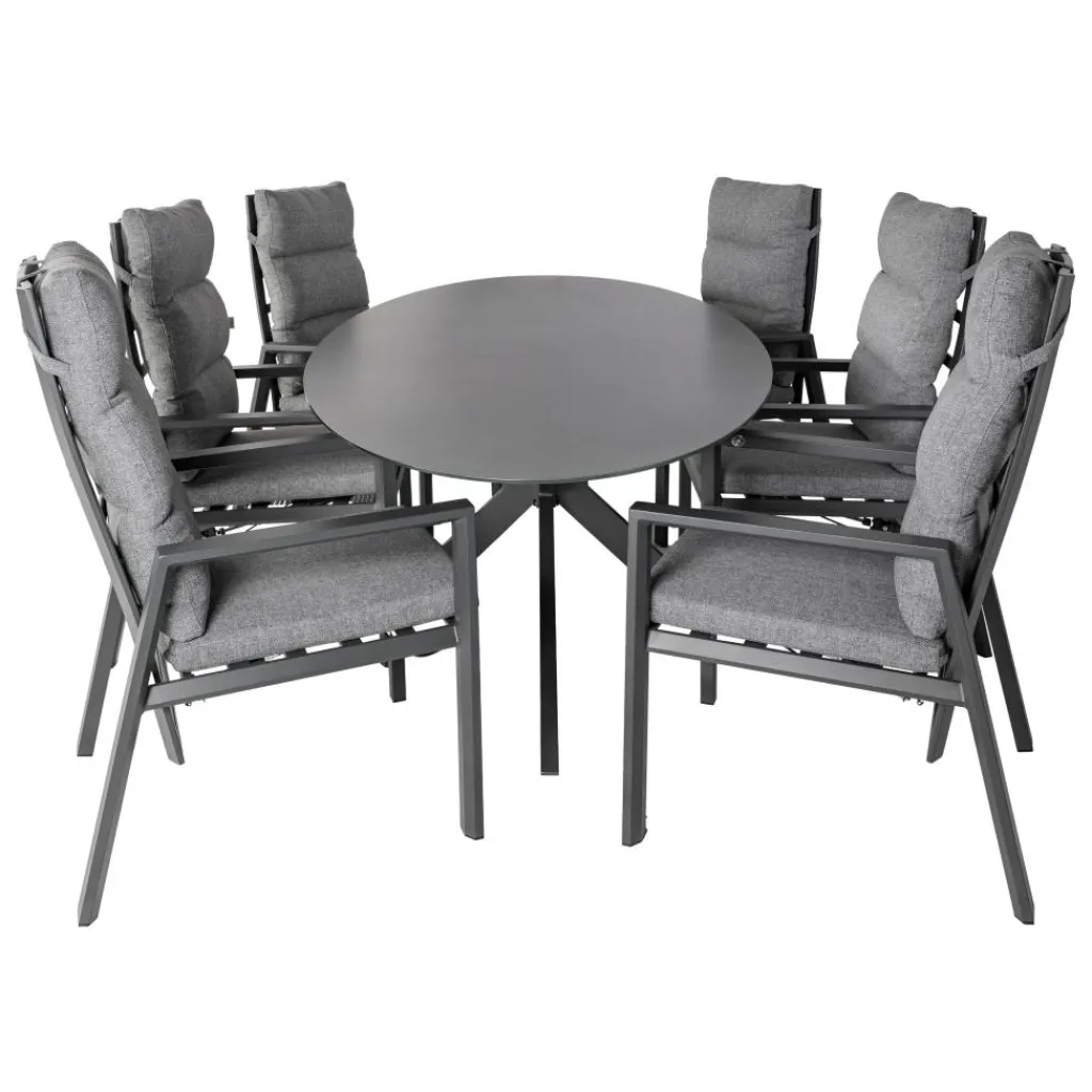 Deze Bardani Varesse 240 x 108 cm Impera 6 tuinset heeft een strak design met moderne uitstraling dankzij de prachtige antraciet kleur. Deze tuinset bestaat uit een grote ovaalvorm tafel met zes stoelen die verstelbaar zijn naar wens. De zachte zit- en rugkussens bieden comfort terwijl het makkelijk te onderhouden materiaal ervoor zorgt dat u vele zomers kunt genieten van deze tuinset van Bardani.