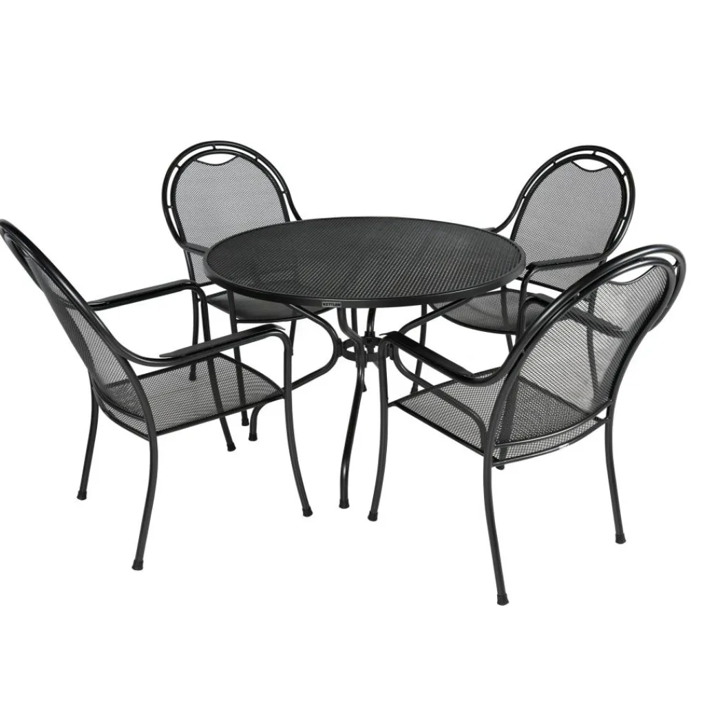 De Strek 105 Ferrol tuinset van ENGARDEN by Kettler biedt een weersbestendige en onderhoudsvriendelijke oplossing met een ingetogen, elegante uitstraling. De set omvat een ronde tuintafel en vier stapelbare Ferrol dining tuinstoelen van Kettler. Vervaardigd uit hoogwaardig en weerbestendig staal en strekmetaal, zijn zowel de tafel als de stoelen afgewerkt met een duurzame Kettlotherm coating.