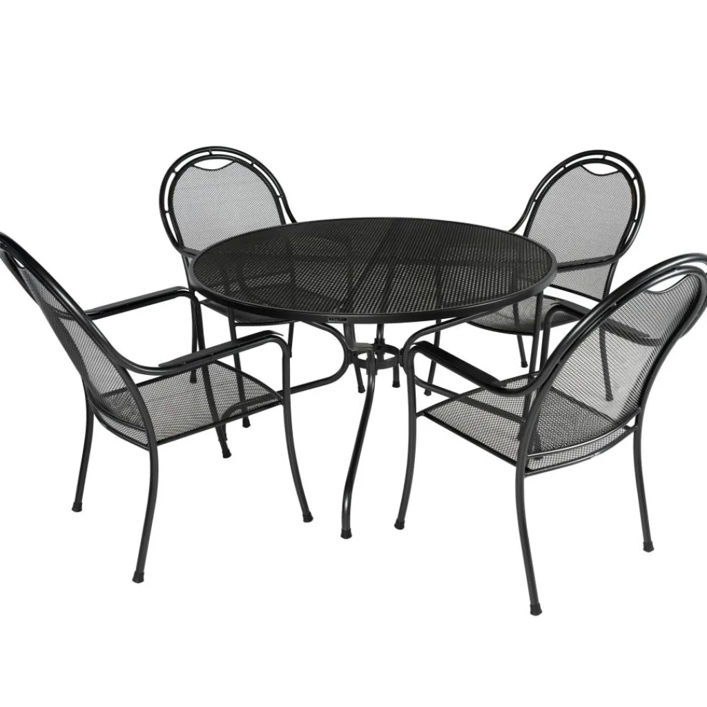 De Strek 120 Ferrol tuinset van ENGARDEN by Kettler omvat een tafel en vier stoelen. Dankzij hun stapelbare ontwerp kunt u ruimte besparen. De stoelen zijn vervaardigd van strekmetaal, wat een glad oppervlak biedt en comfortabel aanvoelt. De ronde tafel, met stabiele stalen poten, is licht van gewicht en UV-bestendig. Met een hoogte van 72 centimeter biedt de tafel een aangename zitruimte. Zowel de tafel als de stoelen zijn bestand tegen verschillende weersomstandigheden.