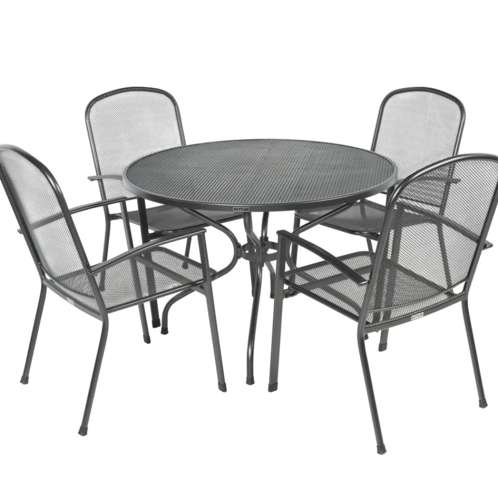 De Strek 105 Vigo tuinset van Kettler is een weersbestendige, onderhoudsvriendelijke set met een eenvoudige, stijlvolle uitstraling. De set bestaat uit een ronde tuintafel en vier Toledo stapelbare tuinstoelen van Kettler. De tafel en stoelen zijn gemaakt van de hoogwaardige en weerbestendige materialen, staal en strekmetaal, afgewerkt met een Kettlotherm coating.