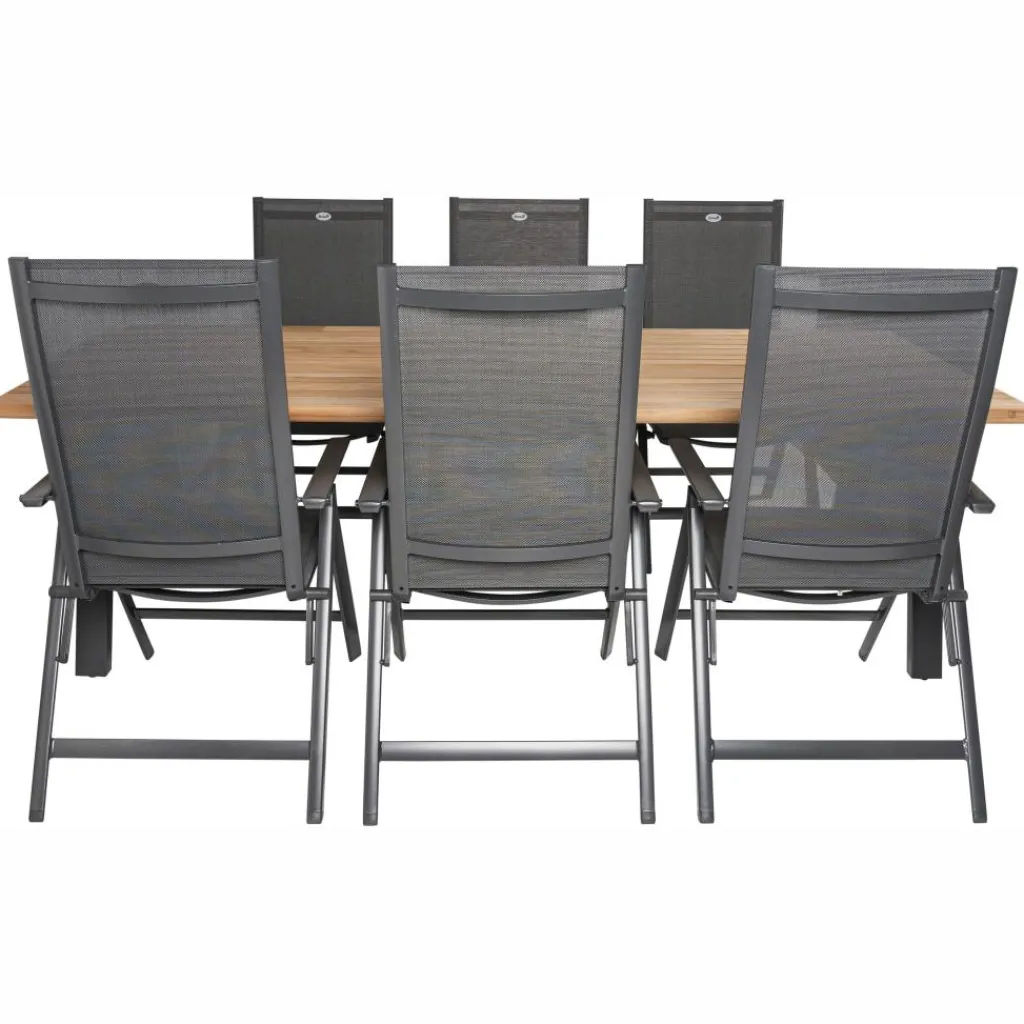 De Taste by 4 Seasons Ambassador 240 x 100 cm Aruba 6 tuinset is een weerbestendige en 7-delige set. De set bestaat uit 6 comfortabele tuinstoelen die licht van gewicht zijn en verstelbaar. Daarnaast heeft de tuinset een robuuste tafel met een moderne teakhouten tafelblad. Hierdoor is de tuinset onderhoudsarm en makkelijk schoon te maken en heeft deze een lange levensduur.