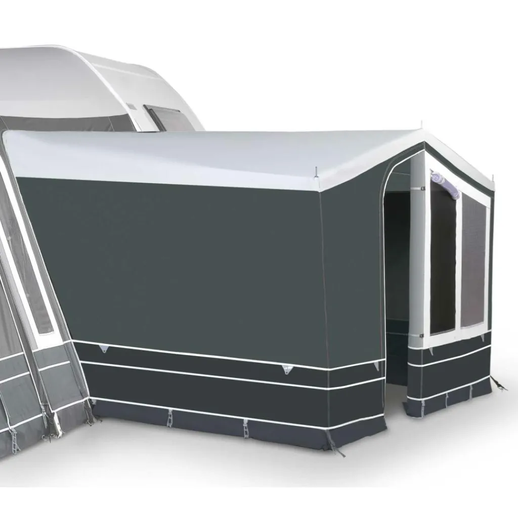 De Dorema Smaragd uitbouw De Luxe XL vormt een prachtige toevoeging aan uw Doréma Smaragd 270 voortent. Met een eigen ingang aan de achterzijde en een afsluitbaar raam met ventilatie biedt de De Luxe uitbouw zowel gemak als frisse lucht. De behoudende hoogte tot achterin zorgt voor een ruimtelijk gevoel. Dankzij een stevige spiraalritssluiting kan de uitbouw aan zowel de linker- als rechterzijwand worden bevestigd. Met een vloeroppervlakte van 250 x 150 cm biedt de XL-uitbouw extra ruimte met dezelfde antraciet/grijze kleurstelling als de voortent. Standaard geleverd met een 25 mm stalen frame voor optimale stabiliteit.