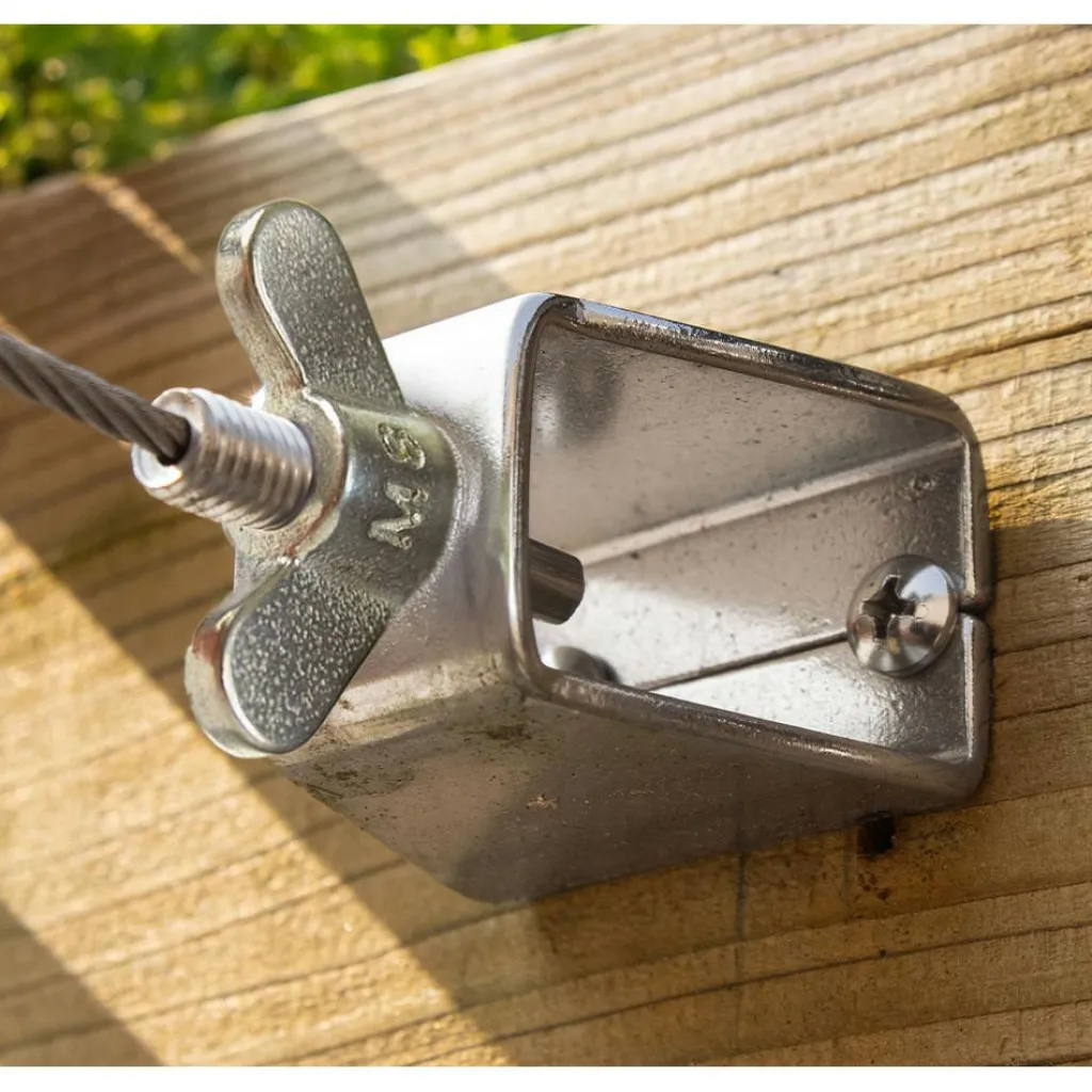 De Shadow Comfort Gordijn bevestiging set bestaat uit twee kabelspanners en 1 staalkabel van 3 mm dik met een lengte van 650 cm. Deze bevestiging set van Shadow Comfort is geschikt om de buitengordijnen van Shadow Comfort op te hangen. Met de kabelspanners kunt u het staaldraad zeer strak spannen.