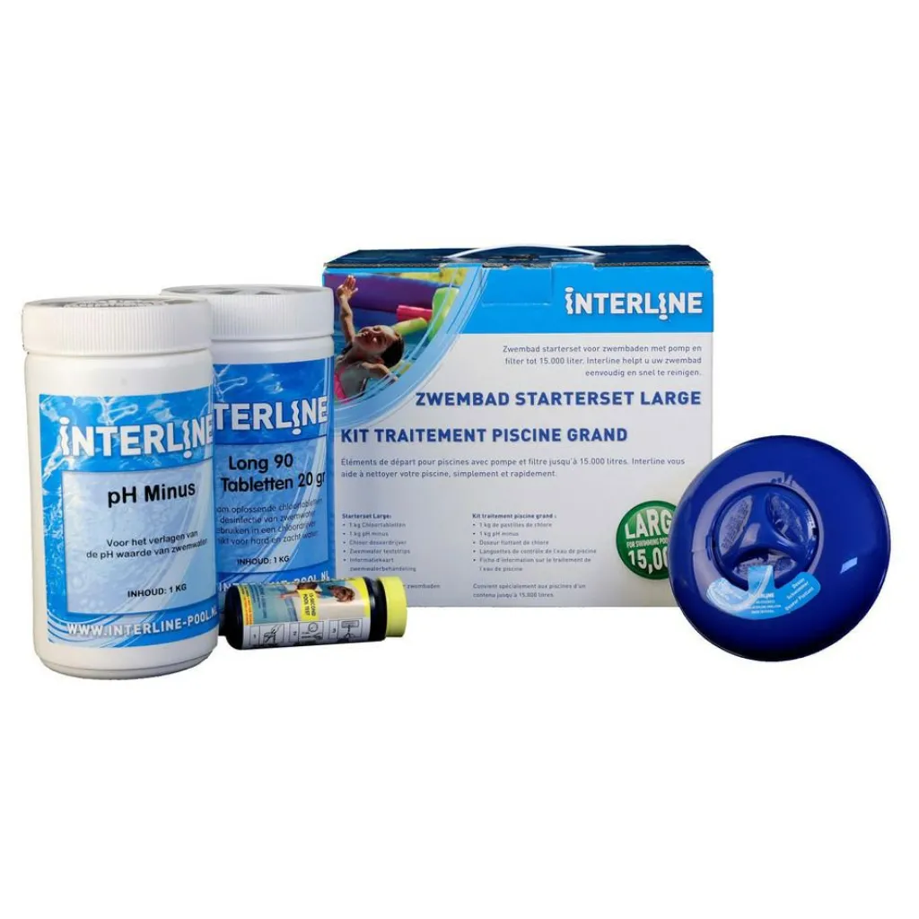 Het Interline Starterspakket zwembadreiniging groot is een compleet basispakket met chemicaliën en accessoires om het zwembadwater te kunnen behandelen. Met deze startersset groot kunt u het zwemwater mooi helder en schoon houden. Dit pakket is geschikt voor grotere zwembaden, met een inhoud tot maximaal 15.000 liter.